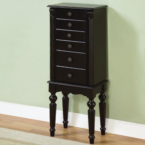 Petite in size but big on style and decorative detail, this beautifully appointed armoire features half-round pilasters, a scalloped skirt and elaborately turned spindle legs. An inset mirror is under its flip-top lid, and side swing doors open to reveal fully lined interior compartments, each with five necklace hooks and matching rayon cords.
